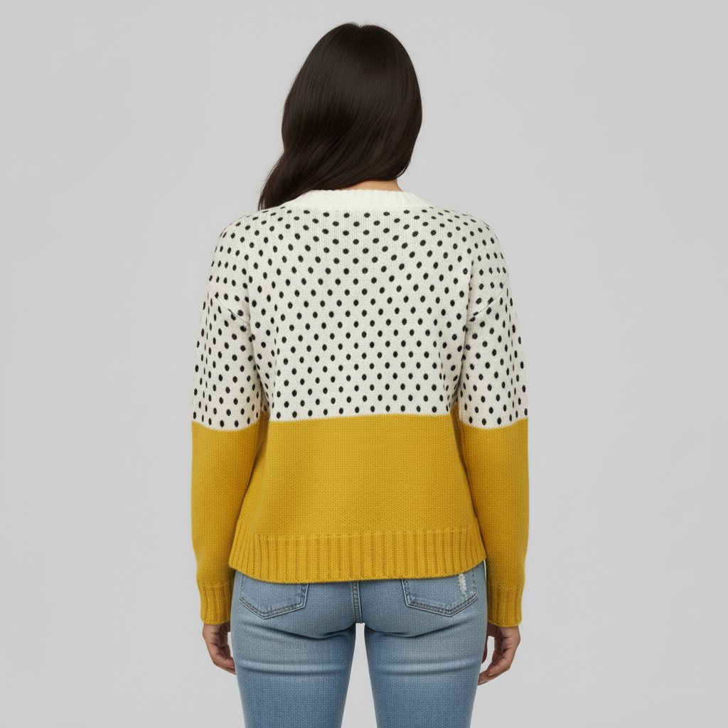 Bold colorblock design combining playful polka dots with a vibrant knit finish